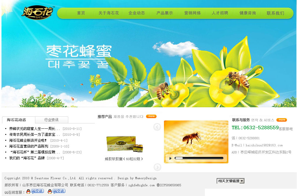 (韓國獨資)棗莊市海石花蜂業(yè)有限公司 海石花蜂業(yè)有限公司始創(chuàng)于1982年7月,座落在舉世聞名的冠世榴園腹地,這里群山起伏,榴花似火,蜜蜂翩翩飛舞,風景秀麗。 海石花蜂業(yè)是一家集養(yǎng)蜂、蜂產(chǎn)品深加工科貿(mào)為一體化的出口型企業(yè),產(chǎn)品出口日本、韓國、加拿大等諸多國家。公司現(xiàn)有四大養(yǎng)蜂基地:中國冠世榴園生態(tài)養(yǎng)蜂基地、云南西雙版納生態(tài)養(yǎng)蜂基地、黃山藥谷養(yǎng)蜂基地、山海關范家鎮(zhèn)有機蜂產(chǎn)品基地.充足的蜜源保證了產(chǎn)品更純、更鮮的特點。海石花企業(yè)擁有多項行業(yè)領先的技術,所有產(chǎn)品均通過HACCP食品安全管理體系認證、綠色食品認證、有機食品認證等. 公司總經(jīng)理周長信曾先后兩次在人民大會堂受到國家總理溫家寶、國家副總理回良玉的親切接見,被譽為中國養(yǎng)蜂狀元.現(xiàn)任中國蜂協(xié)理事,市政協(xié)常委委員. 由著名導演張惠中執(zhí)導,張繼編劇的電視連續(xù)劇《石榴花開》中海石花蜂業(yè)系列蜂產(chǎn)品有多次不同角度的呈現(xiàn),《石榴花開》的許多劇情都是在海石花公司、海石花養(yǎng)蜂基地拍攝的,首播已在陜西綜藝臺等地方電視臺陸續(xù)開播,隨后各地方衛(wèi)視都將全面播出。 公司不斷發(fā)展壯大,形成了集海石花蜂業(yè)養(yǎng)蜂基地、海石花蜂業(yè)生產(chǎn)基地為一體的現(xiàn)代化、規(guī)模化的出口型企業(yè),成為國內(nèi)同行業(yè)中的佼佼者。 海石花蜂業(yè)有限公司技術力量雄厚,產(chǎn)品已發(fā)展為六大系列、100多個單品,產(chǎn)品出口日本、韓國、加拿大等諸多國家。 棗莊網(wǎng)站制作 |