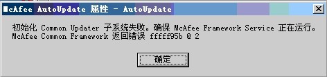 作為一名忠實(shí)的麥粉,多年來我一直使用McAfee這款殺毒軟件。但近一周開始McAfee出現(xiàn)無法更新的狀況,自動更新和手動更新都失敗,彈出錯(cuò)誤提示窗口的信息為“初始化Common Updater子系統(tǒng)失敗.確保McAfee Framework service正在運(yùn)行.McAfee Framework service返回錯(cuò)誤 ffffffdf @ 3”。